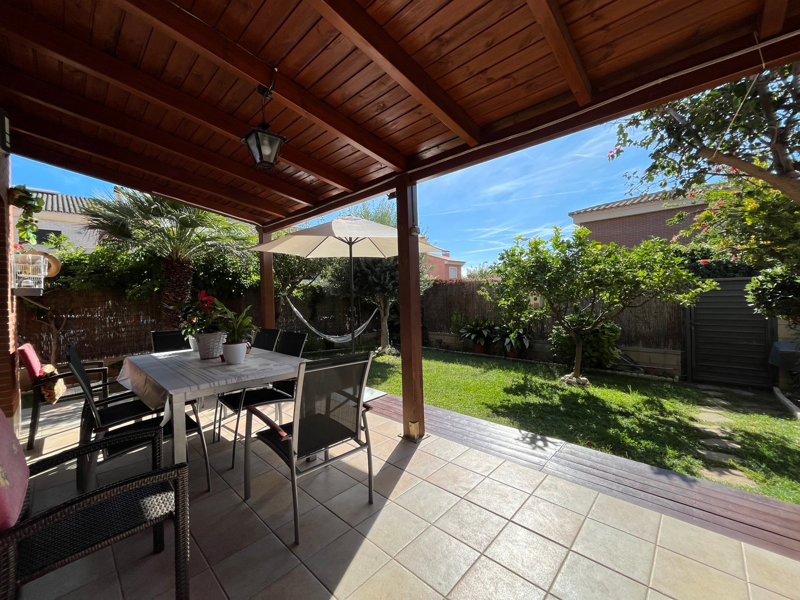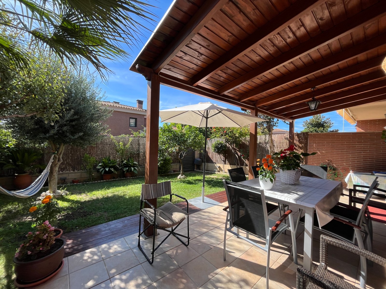 El chalet cuenta con todas las comodidades: calefacción central, aire acondicionado, garaje en el mismo edificio y televisión. Además, la urbanización dispone de piscina comunitaria, ideal para disfrutar en familia durante los meses de verano.
